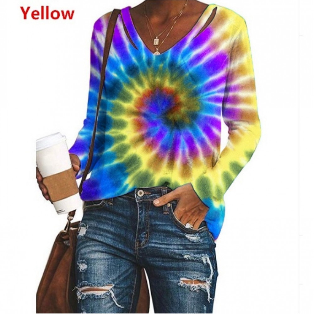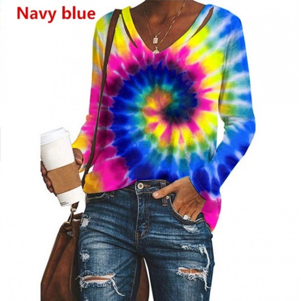 New Women's V-Neck Tie-Dye Printing Long-Sleeved Loose Top T-Shirt